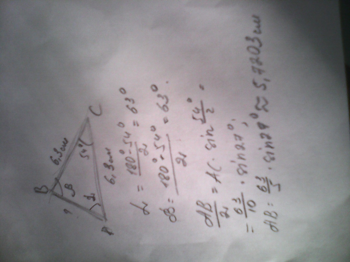 В треугольнике ABC стороны BC=6.3,AC=6.3 и угол С=54 градуса. Найдите сторону АВ и остальные углы.и плюс чертеж тоже плиз. плиз срочно. АВ решение скажите плиз