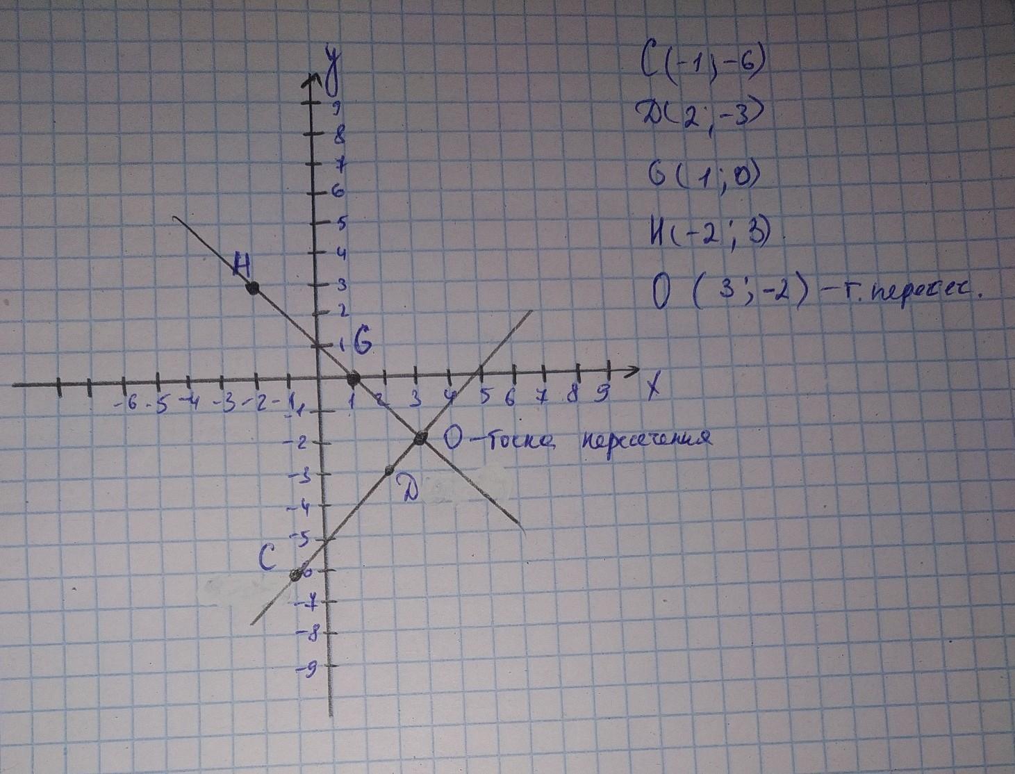 На координатной плоскости постройте прямую, прохо- дящую через точки С(-1;-6) и D(2;-3), и прямую, про- ходящую через точки G(1:0) и н(-2;3). Найдите коорди- наты точки пересечения этих прямых.