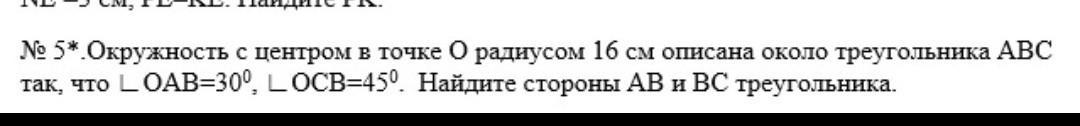 Треугольник ОAB равнобедренный , OA = OB = 16 см ( радиусы ) ; zA = zB = 30 ° - по условию ; ОН - высота ОAB , равна 16 / 2 = 8 см ( катет против угла 30 ° ) ; AB = 2 * AH = 2 * √ ( 16² - 8² ) = 16√3 см . Треугольник СОВ равнобедренный , Oc = OB = 16 см ( радиусы ) ; < C = < B = 45 ° = < 0 = 90º - прямоугольный CB = √ ( 16² + 16² ) = 16√2 CM . АВ = 16√3 см ; BC = 16√2 CM .
