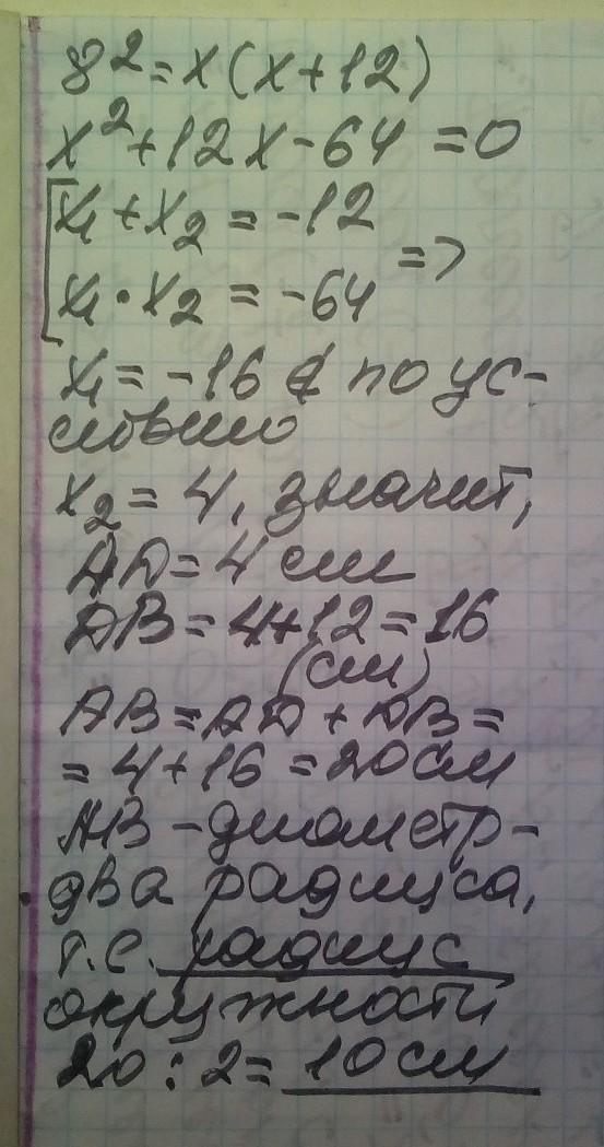 ВН=4 см, АН=16 см. АВ=4+16=20 см; R=20:2=10 см