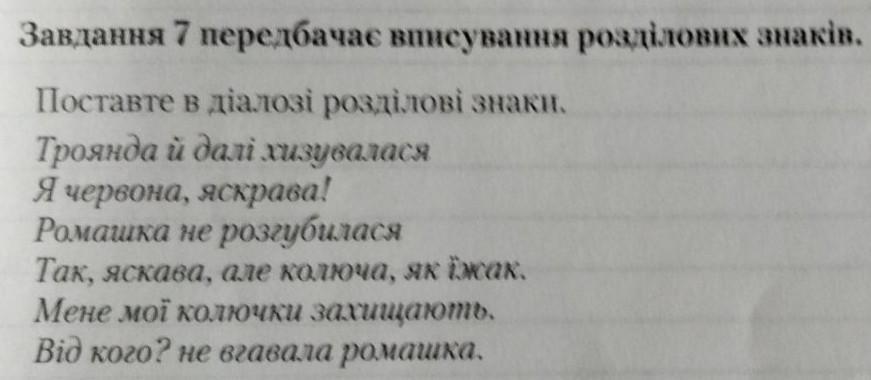 Завдання 7 передбачає вписування розділових знаків. 7. Поставте в діалозі розділові знаки. Троянда й далі хизувалася Я червона, яскрава! Ромашка не розгубилася Так, яскава, але колюча, як їжак. Мене мої колючки захищають. Від кого? не вгавала ромашка. допоможіть будь ласка потрібно зараз