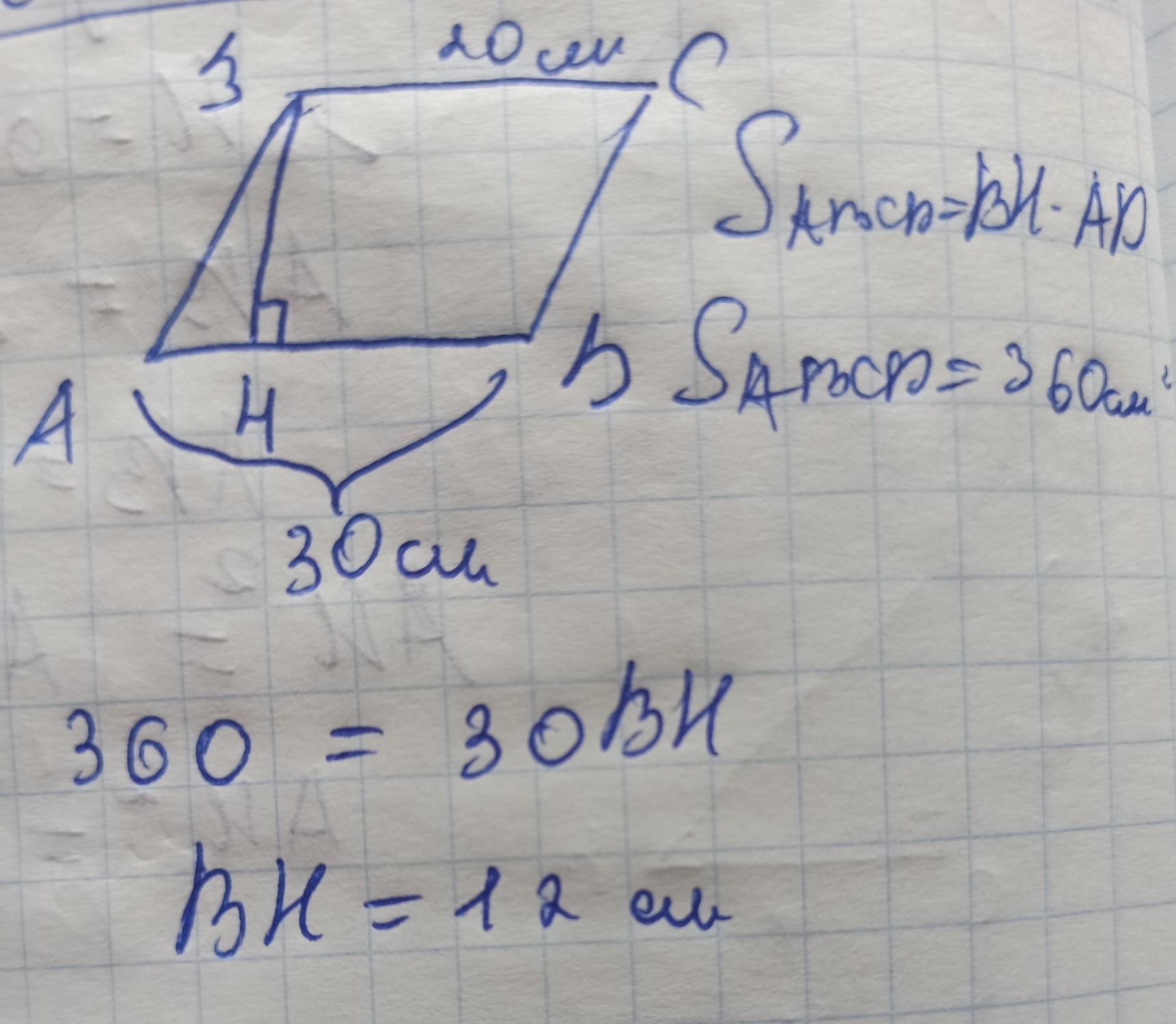 Сторони паралелограма 1 балл дорівнюють 30 см та 20 см, а його площа дорівнює 360 см2. Знайти висоти паралелограма. даю 30 балов