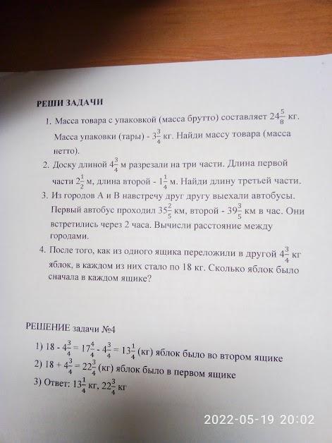 24 5/8 - 3 3/4 = 24,625 - 3,75 = 20,875 = 20 7/8 (кг) - масса нетто.