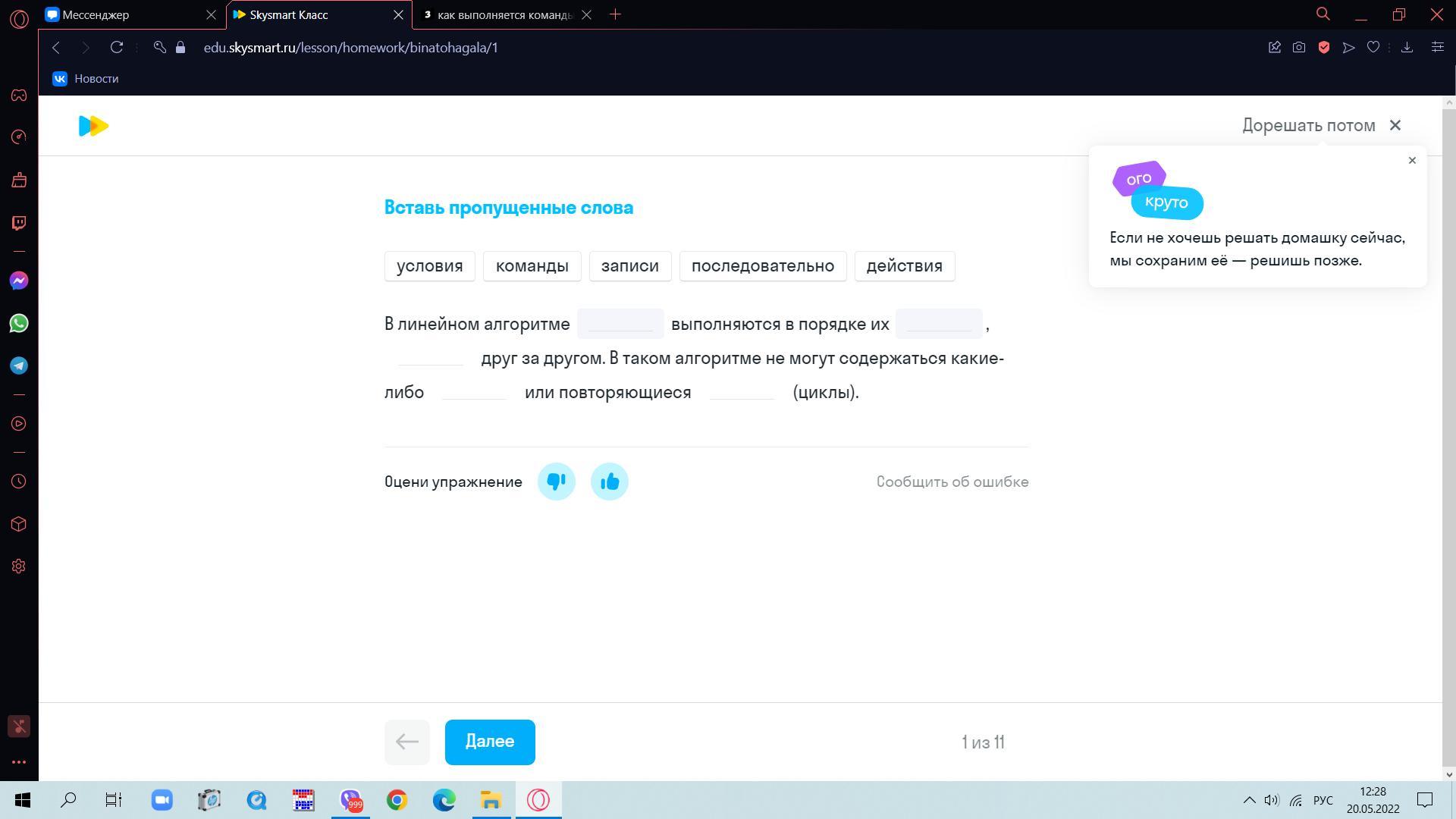 В линейном алгоритме [команды] выполняются в порядке их [записи], [последовательно] друг за другом.