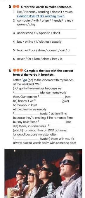 We don't go in the evenings because we are doing our homework then. Our teacher won't be happy if we give our homework in late! At the cinema we usually watchaction films because they're exciting. I like romantic films but my best friend doesn't like them, so sometimes i watch romantic films on DVD at home. It's good because my sister often watches them with me. It's always nice to watch a film with someone else!