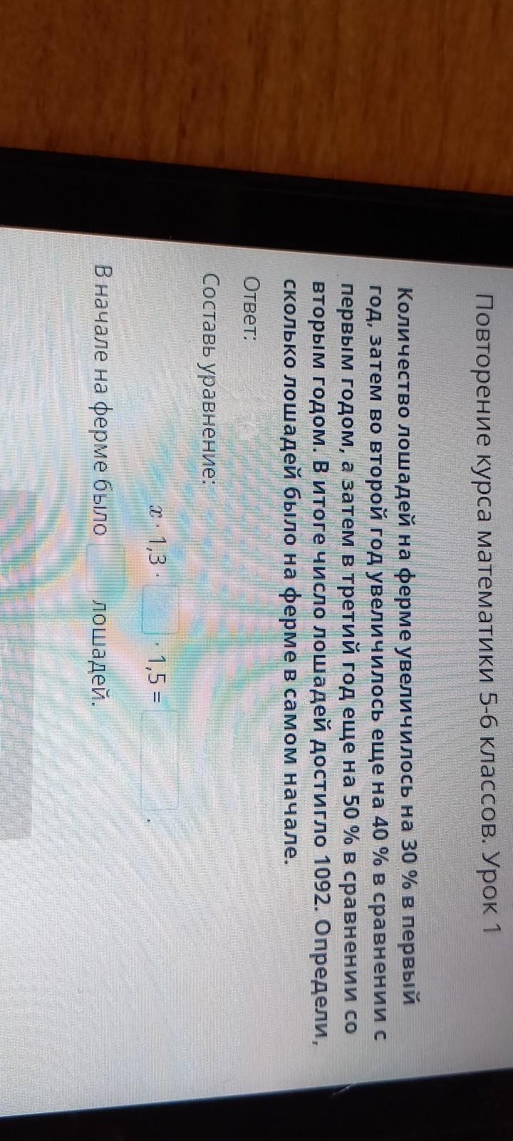 К Повторение курса математики 5-6 классов. Урок 1 Количество лошадей на ферме увеличилось на 30 % в первый год, затем во второй год увеличилось еще на 40% в сравнении с первым годом, а затем в третий год еще на 50 % в сравнении со вторым годом. В итоге число лошадей достигло 1092. Определи, сколько лошадей было на ферме в самом начале. Ответ: Составь уравнение: х. 1,3. 3.1.5 1,5 = В начале на ферме было лошадей. ?