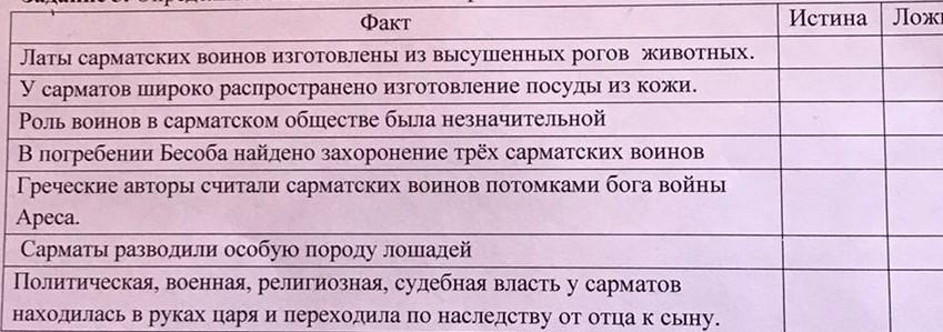 Задание 3. Определите истинные и ложНЫ факты: факт Латы сарматских воинов изготовлены из высушенных рогов животных. У сарматов широко распространено изготовление посуды из кожи. Роль воинов в сарматском обществе была незначительной В погребении Бесоба найдено захоронение трёх сарматских воинов Греческие авторы считали сарматских воинов потомками бога войны Apeca. Сарматы разводили особую породу лошадей Политическая, военная, религиозная, судебная власть у сарматов находилась в руках царя и переходила по наследству от отца к сыну. Истина ложь