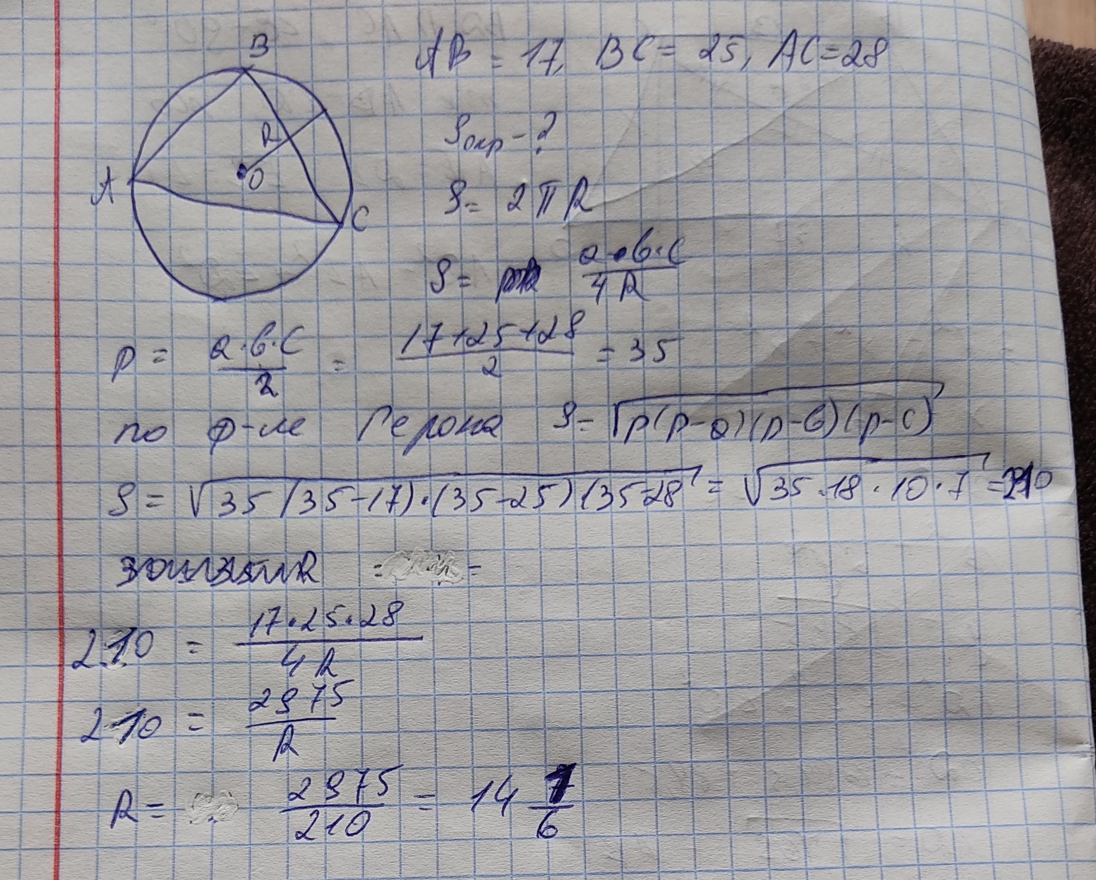 Площадь =3.14*85/6*85/6=628, 99 ответ