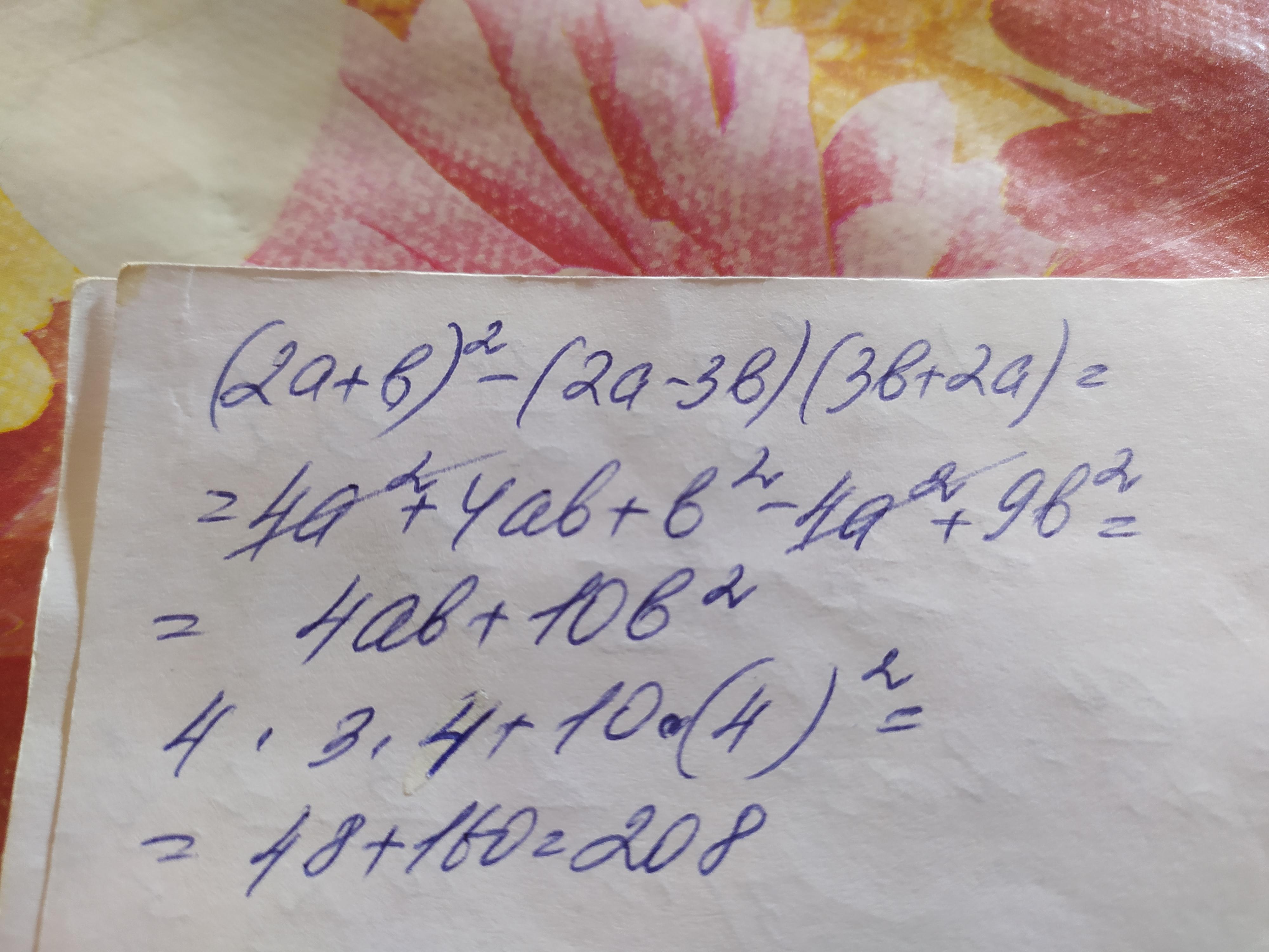 Упростить выражение, и найдите его значение при а=3, b=4. (2a + b)2 – (2a – 3b)(3b + 2a)
