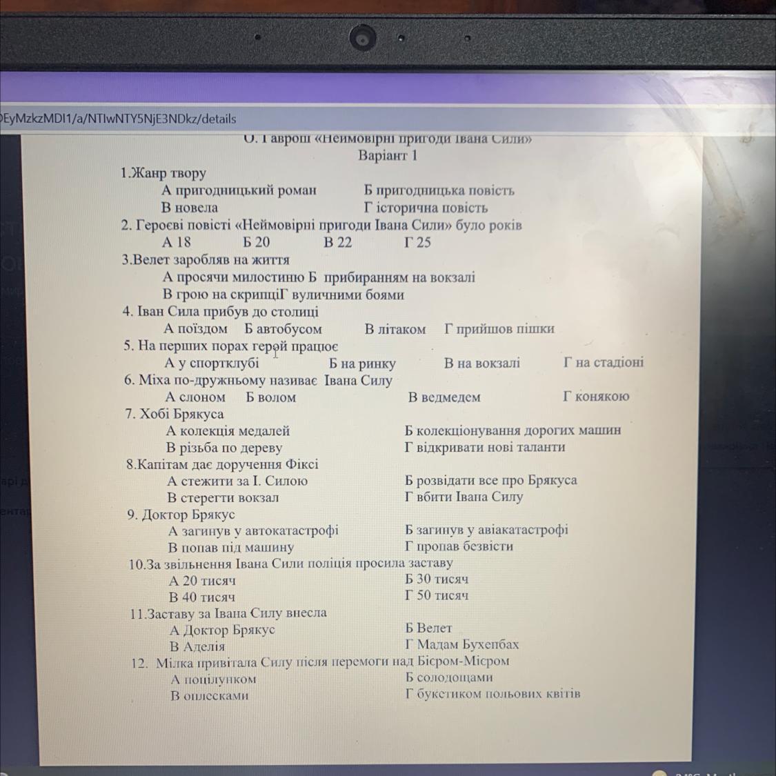 1Б (повість), 2Б (20 років), 3Г (вуличними боями) 4А(поїздом), 5В (на вокзалі), 6В (ведмедем), 7Г (відкривання талантів), 8В(стерегти вокзал - це моя думка, тому що слідом він ще попросив дізнатися все про Брякуса), 9А (загинув у автокатастрофі), 10Г (50 тисяч), 11Г (мадам Бухенбах, правда звали її Аделія, тому варіант В не зрозуміло навіщо вписали), 12Г (букетиком польових квітів)