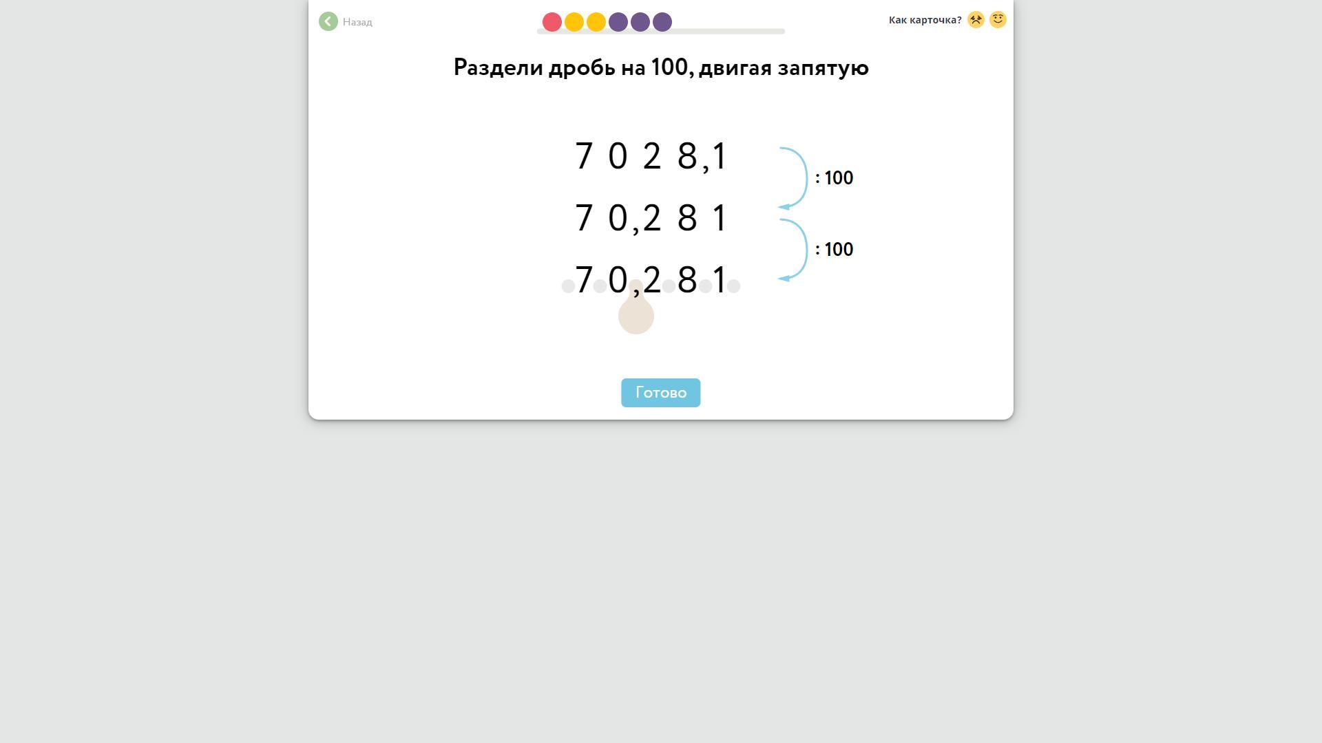 Смотри: когда ты делишь на 10 или 100 и т.д., то ты запятую двигаешь ВЛЕВО, а когда умножаешь на 10 или 100 и т.д., то двигаешь запятую ВПРАВО.