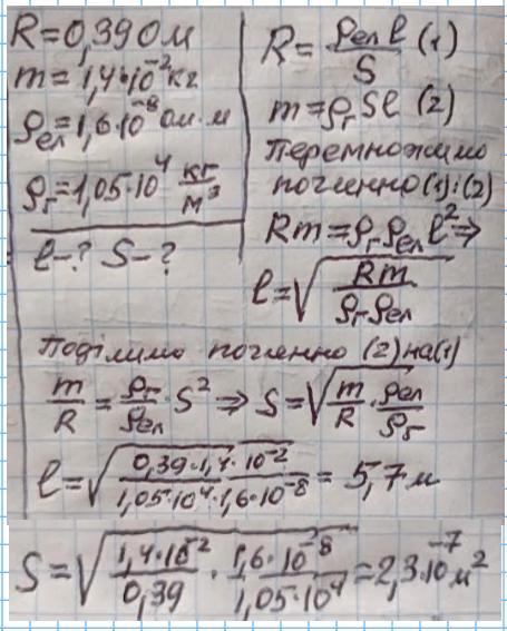 Задача .Моток дроту, що виготовлений з серебра, має опір 0,39 Ом та масу 0,014 кг. Знайти довжину дроту та площу поперечного перерізу