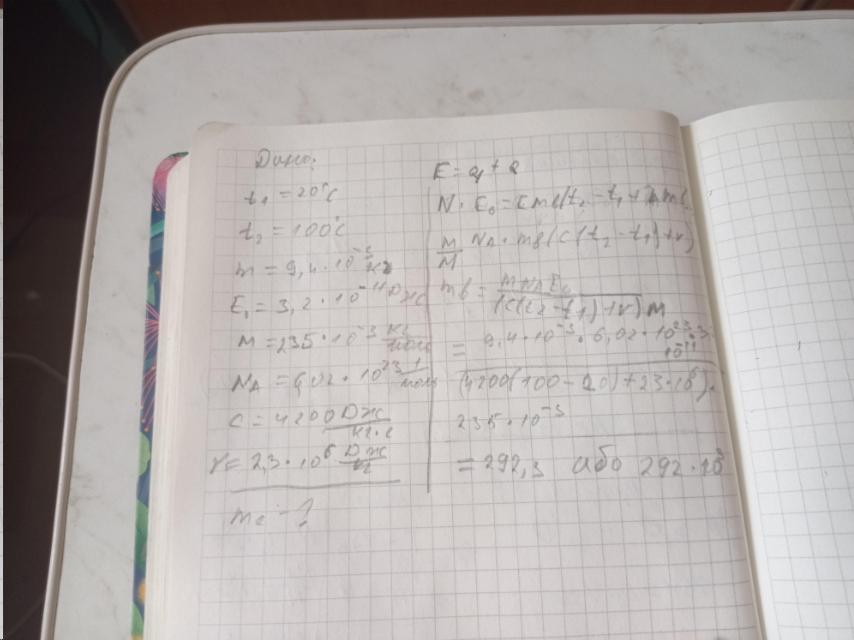 Скільки води можна нагріти від 20 до 100 °С і випарити за рахунок енергії, що виділяється під час поділу 9,4 г Урану-235? Уважайте, що внаслідок кожного поділу ядра виділяється енергія 200 МеВ. Втрати енергії не враховуйте. Питома теплоємність води 4200 Дж/(кг∙℃); питома теплота пароутворення води 2,3∙106 Дж/кг
