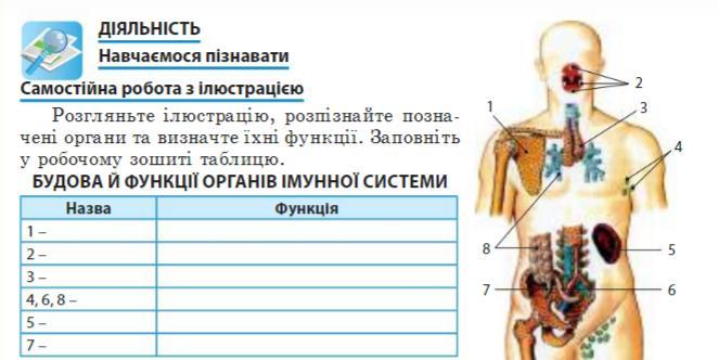 СРОЧНО ПРОШУ! Розгляньте ілюстрацію, розпізнайте позначені органи та визначте їхні функції. Заповніть У робочому зошиті таблицю.