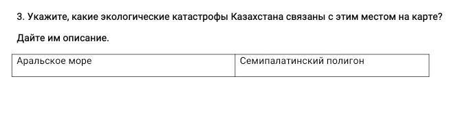 3. Укажите, какие экологические катастрофы Казахстана связаны с этим местом на карте? Дайте им описание. Аральское море Семипалатинский полигон