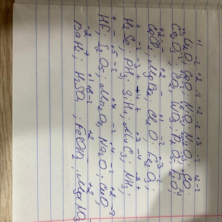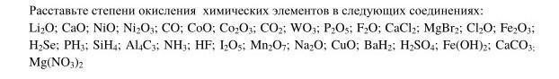 Расставьте степени окисления химических элементов в следующих соединениях: Li2O; CaO; NiO; Ni2O3; CO; CoO; Co2O3; CO2; WO3; P2O5; F2O; CaCl2; MgBr2; Cl2O; Fe2O3; H2Se; PH3; SiH4; Al4C3; NH3; HF; I2O5; Mn2O7; Na2O; CuO; BaH2; H2SO4; Fe(OH)2; CaCO3; Mg(NO3)2