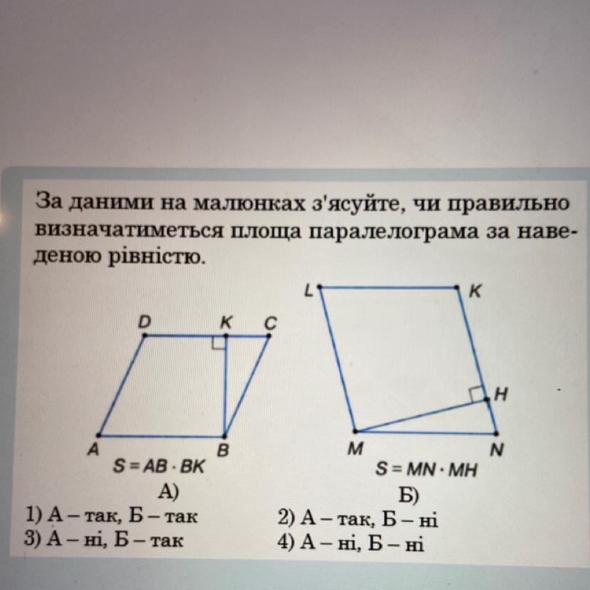 щоб знайти площу паралелограма потрібно висоту помножити на довжину до якої проведено висоту, тобто у першому паралелограмі щоб знайти площу потрібно BK*DC, а у другому потрібно МН*NK