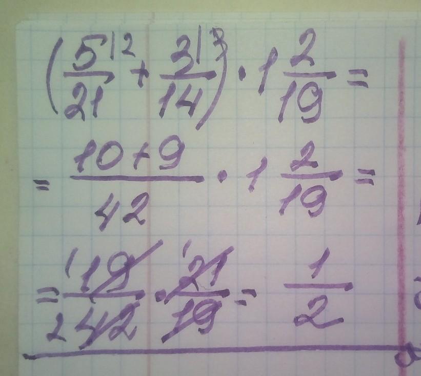 | 5/21 + 3/14 = 10/42 + 9/42