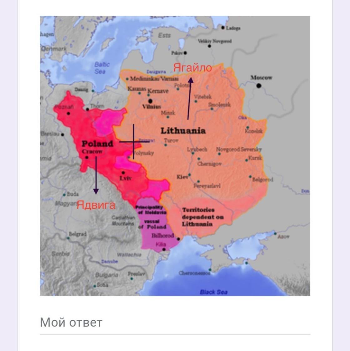 1385 кревська унія через одруження між Литовським князем Ягайло та польскою королевою Ядвигою. Наслідки - початок формування Речі посполитої як единої держави та християнизація Литовського князівства. Українські замлі поділені між Литвою та Польшею і не мають ніякого впливу на події.