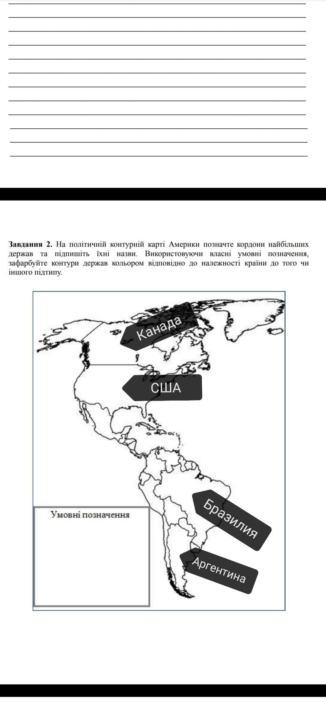 Завдання 2. На політичній контурнiй картi Америки позначте кордони найбільших держав та підпишіть їхні назви. Використовуючи власні умовні позначення, зафарбуйте контури держав кольором відповідно до належності країни до того чи іншого підтипу.