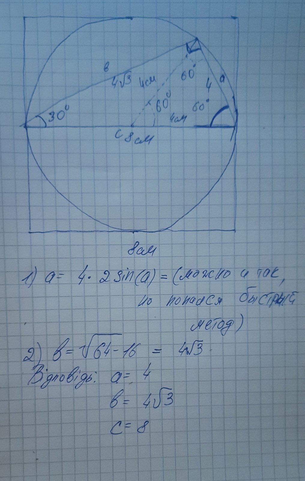 Квадрат со стороной 8 см описан около окружности. Найдите площадь прямоугольного треугольника с острым углом 30°, вписанного в данную окружность. С РИСУНКОМ!