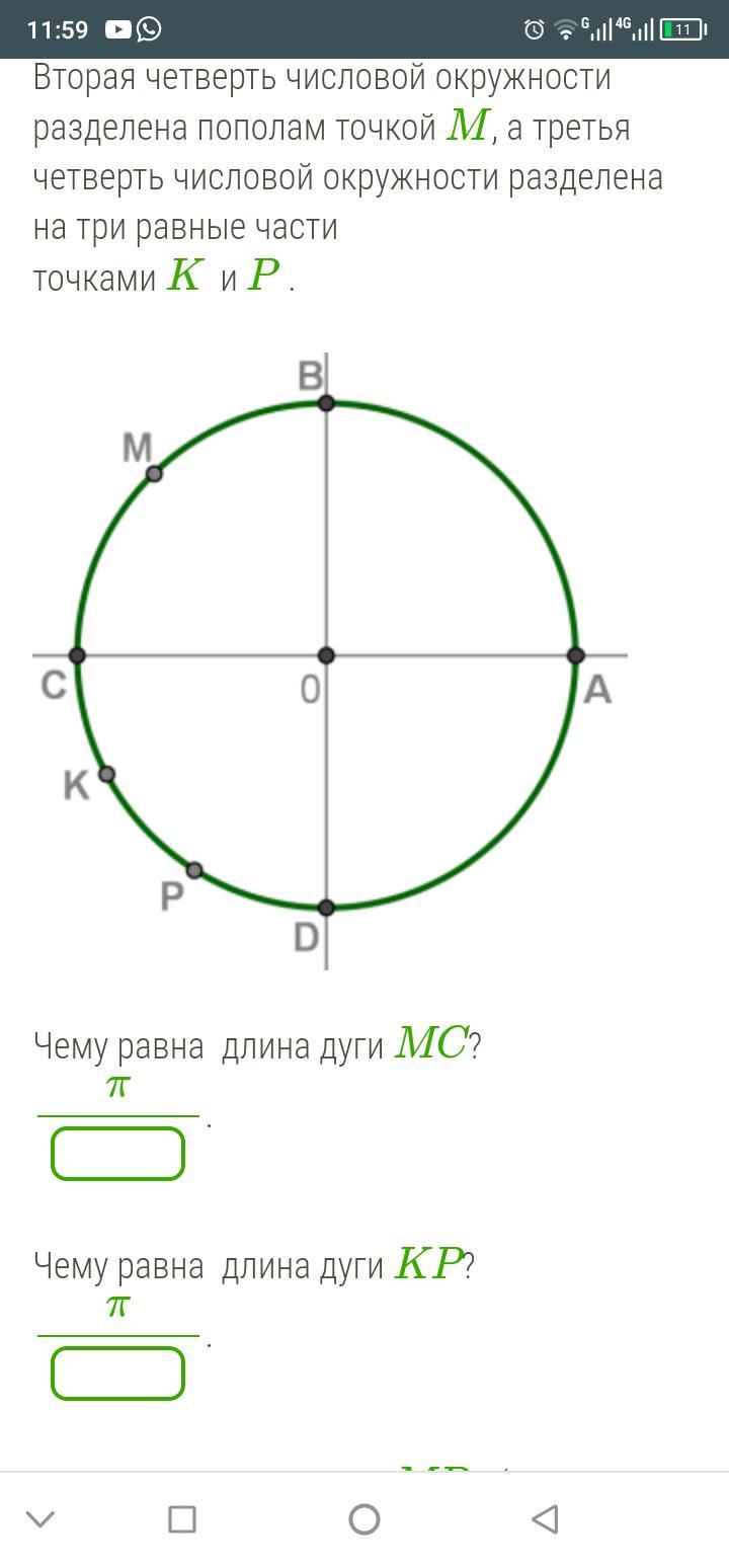 Вторая четверть числовой окружности разделена пополам точкой М, а третья четверть числовой окружности разделена на три равные части точками К и Р.
