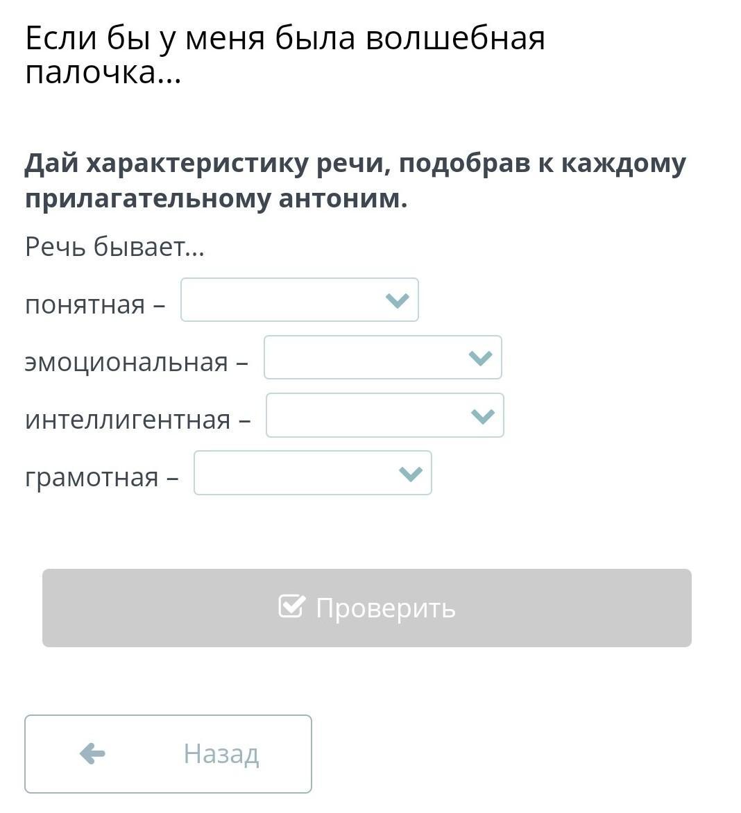 Если бы у меня была волшебная палочка... Дай характеристику речи, подобрав к каждому прилагательному антоним. Речь бывает... понятная эмоциональная - интеллигентная – - грамотная - <