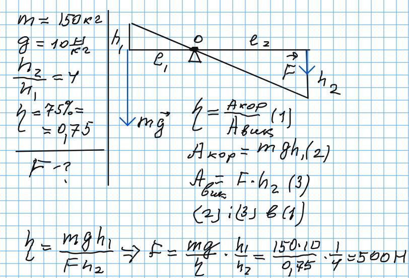 За допомогою невагомого важеля археологи піднімали, знайдений камінь масою 150 кг. Яку силу вони приклали до важеля, якщо відомо, що точки прикладання кінців важеля пройшли відстані, що відрізняються в 4 рази, а ККД становить 75%?