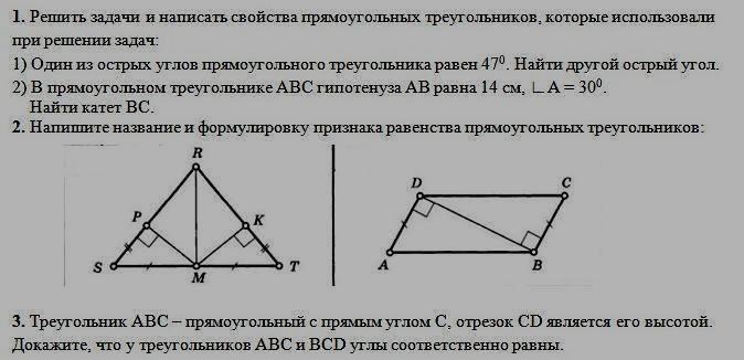 1) 90-47=43 сумма острых углов в ррямоугольном треугольнике равна 90°