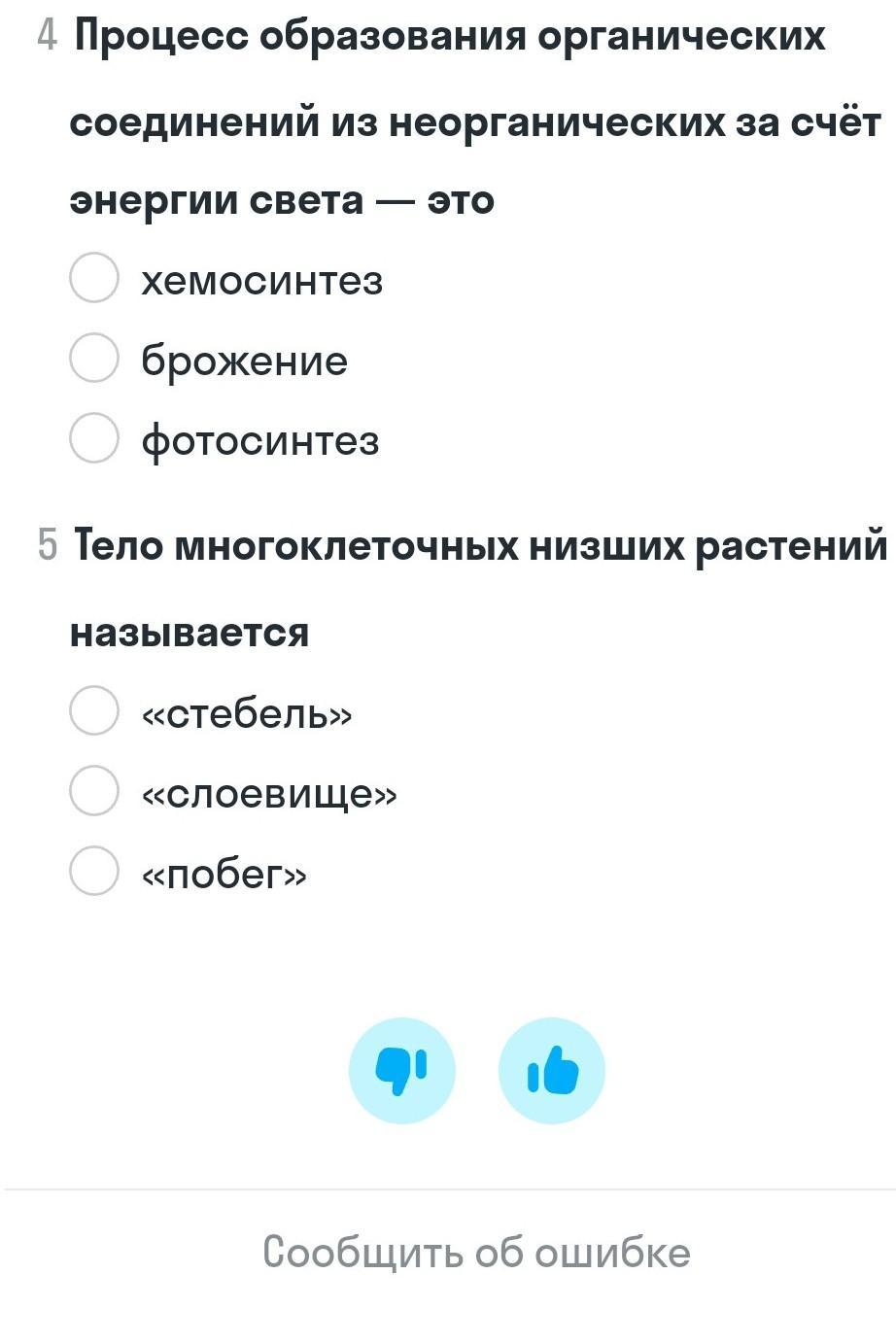 4 Процесс образования органических соединений из неорганических за счёт энергии света - это хемосинтез брожение фотосинтез 5 Тело многоклеточных низших растений называется > «слоевище» «Побег>>