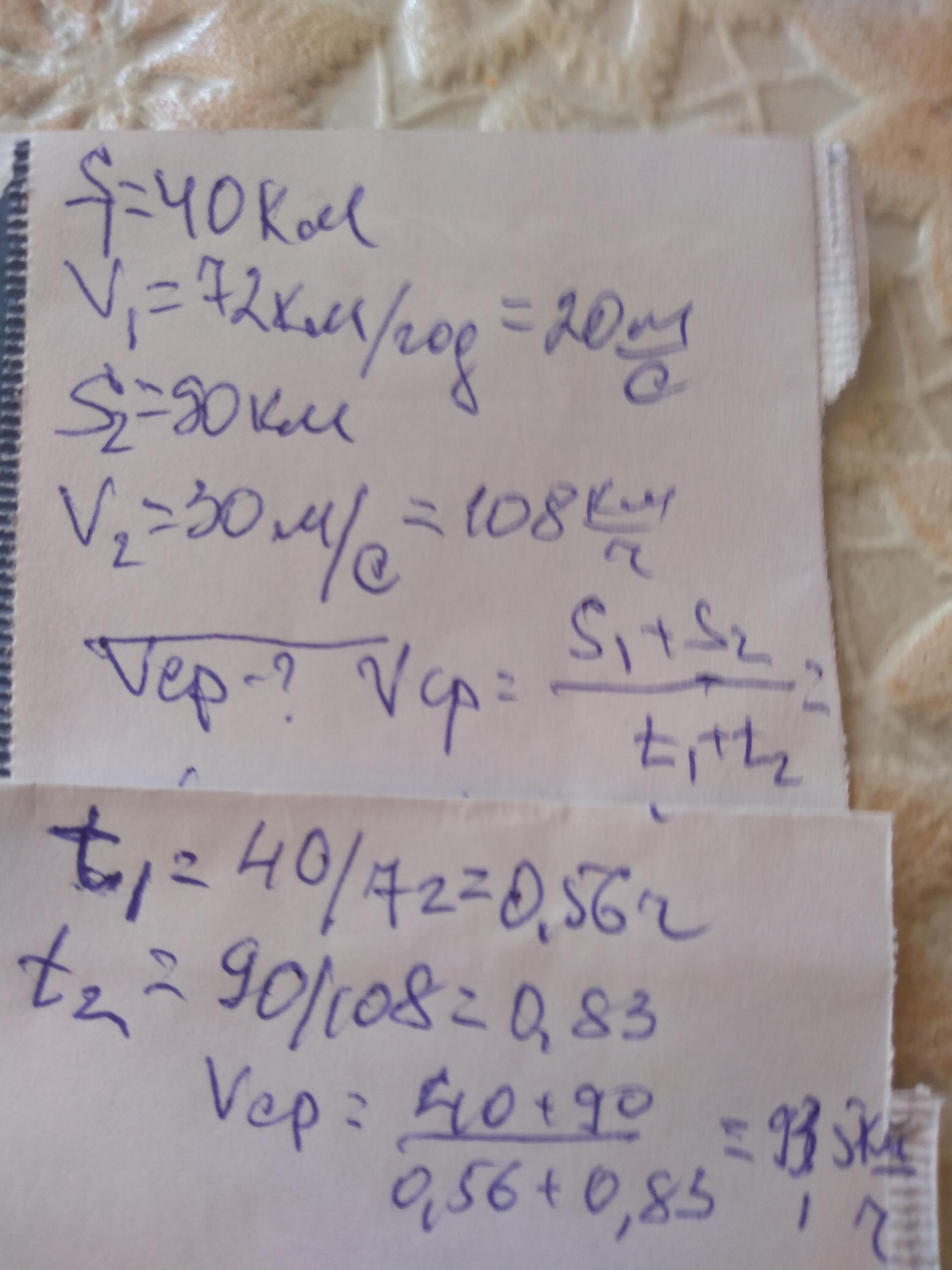 КР ПИШУ!!!Поїзд проїхав перші 40 км із швидкістю 72 км/год і наступні 90 км – із швидкістю 30 м/с. Визначте середню швидкість поїзда на усьому шляху.