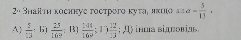 ну конечно Г) есть такое "основное тригонометрическое тождество", что сумма квадратов синуса и косинуса угла равно 1. Но вообще-то именно эта задачка сразу решается, если запомнить несколько первых Пифагоровых троек. Здесь срабатывает "вторая" 5,12,13 (напомню, первая 3,4,5). То есть существует такой прямоугольный треугольник, у которого катеты 5 и 12, а гипотенуза 13. Соответственно, если синус угла 5/13, то косинус 12/13