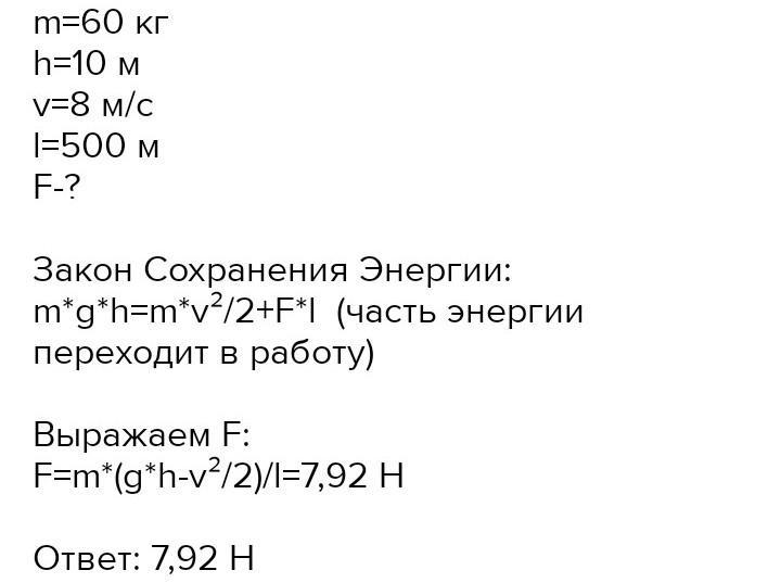 Схилом гори завдовжки 500 м та висотою 10 м скотилися санки вагою 60 кг. Визначте середню силу опору руху під час спуску санок, якщо біля пiдошни гори нони мали швидкість 8M / c Початкова швидкість санок дорівнює нулю.
