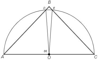 Угол при вершине равнобедренного треугольника 86°. На основании треугольника как на диаметре построена полуокружность, боковые стороны делят её на три дуги. Найти градусные меры этих дуг.