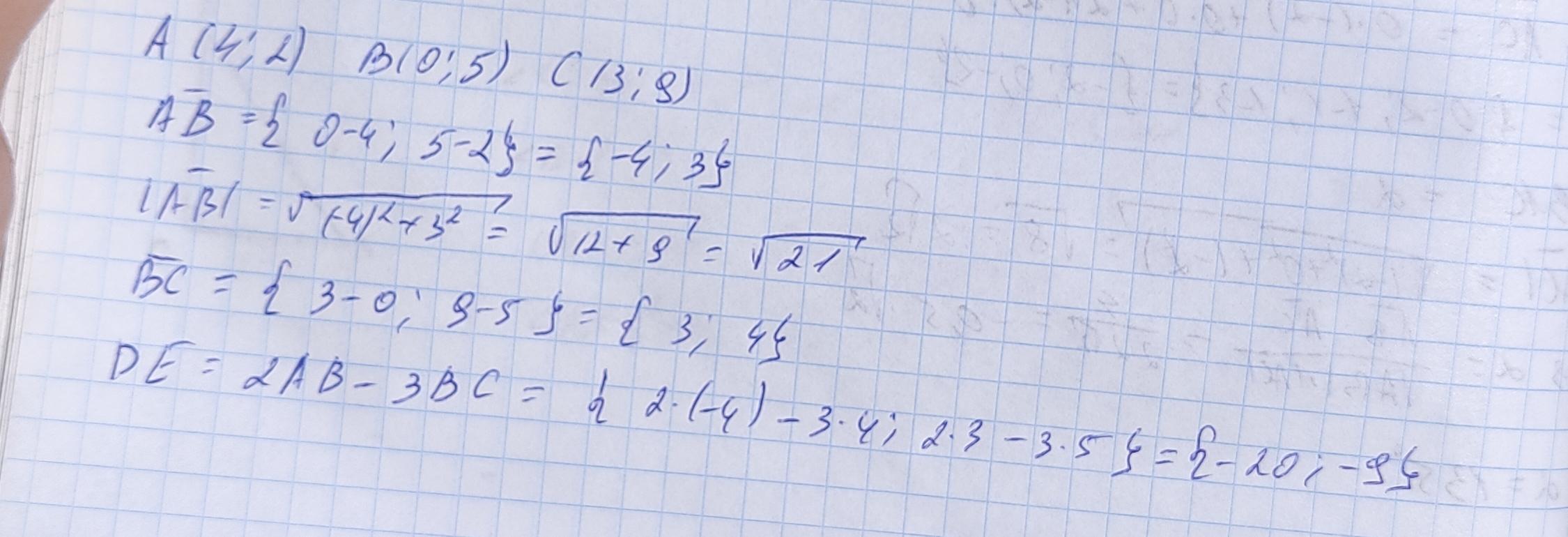 Дано точки А(4; 2), B(0; 5), C(3; 9). Знайдіть: 1) координати і абсолютну величину вектора АВ 2) координати вектора DE = 2AB - 3BC. Срочно