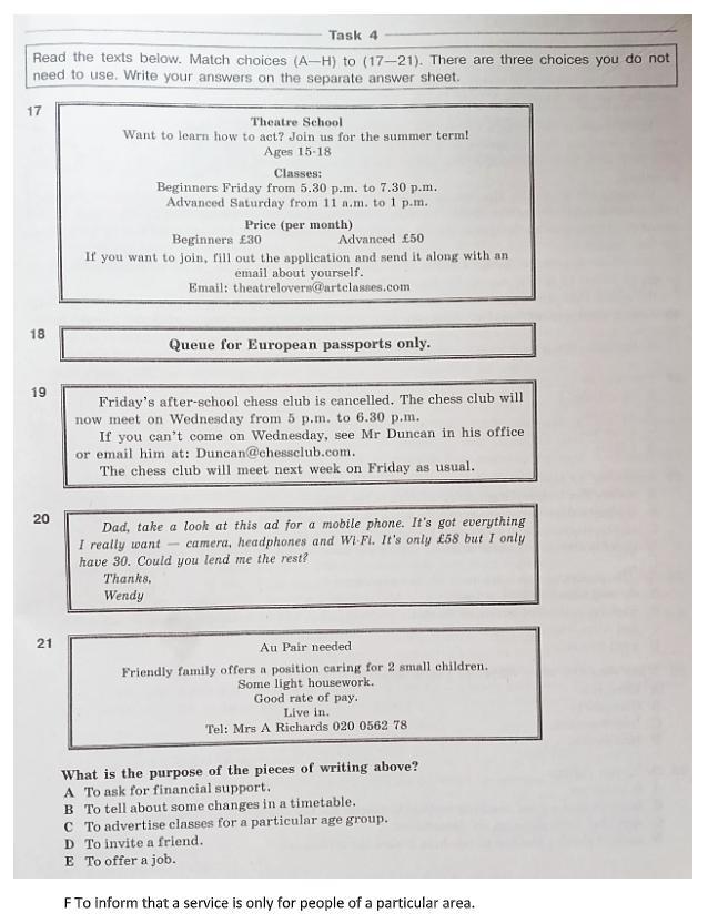 СРОЧНО ДАЮ 100 БАЛОВ! Read the texts below. Match choices (A-H) to (17-21). There are three choices you do not