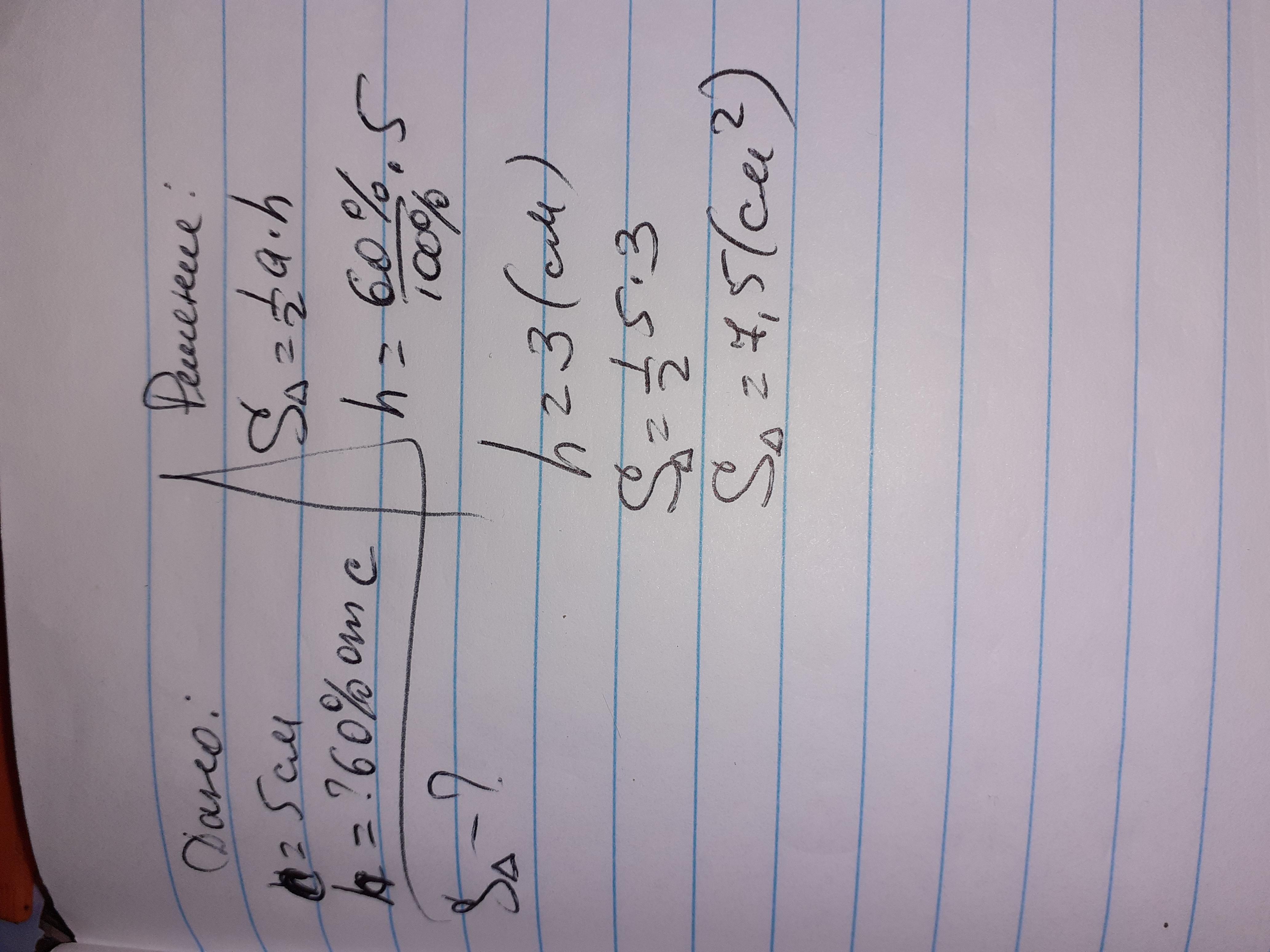 Основание треугольника равно 5см, а высота составлят 60% основания ,вычисли площадь треугольника
