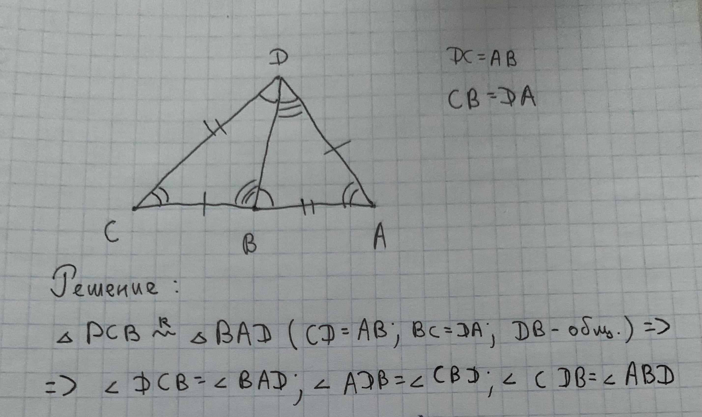 В треугольнике DСB и треугольнике DAB сторона DC равна стороне AB и сторона CB равна стороне DA. Докажите, что угол CDB равен углу ABD.