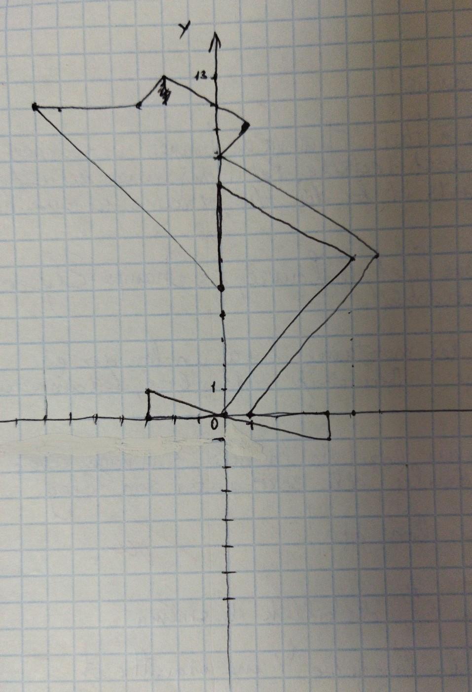 (0;0) (-3;0) (-3;-1) (4;-1) (4;0) (1;0) (6;6)(0;10) (1;11) (-2;13) (-3;12) (-7;12) (0;5) (0;9) (5;6) (0;0)