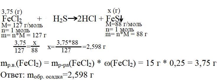 Через раствор хлорида железа (ll) массой 15г и массовой долей 25 % пропустил избыток сероводорода. Вычислите массу осадка , образовавшегося в результате реакции.