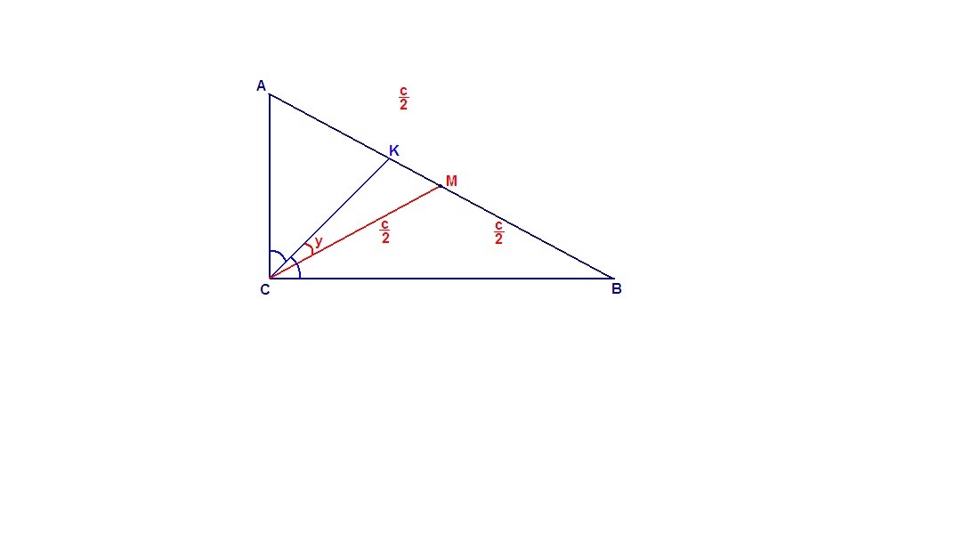 Угол между медианой и биссектрисой,проведенной из вершины прямого угла прямоугольного треугольника равен y,а гипотенуза равна с.найти S. треугольника