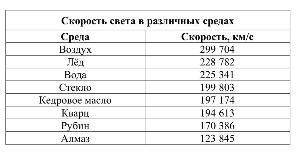 Известно, что солнечные лучи достигают Земли за 8 минут 20 секунд. Скорость света в вакууме 299 792 км/с. Пользуясь таблицей, определите, в каких средах свет пройдёт то же самое расстояние менее чем за 12 минут? Ответ кратко поясните.