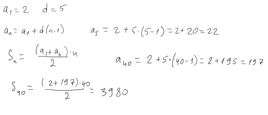 знайдіть п'ятий член арифметичної прогресії та суму перших сорока членів арифметичної прогресії, у якої перший член дорівнює 2 а різниця 5. допоможіть як пошвидше потрібно здати, залишилось 17 хвилин