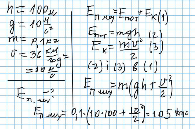 Обчислити повну механічну енергію ластівки, яка летить на висоті 100 м над землею і має швидкість 36 км/год. Маса ластівки 0,1 кг. (g = 10 м/с2)