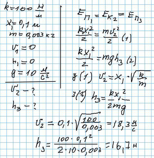 В пружинному пістолеті жорсткість пружини 100Н/м. З якою швидкістю вилітатиме з нього кулька масою 3г, якщо пружина стиснута на 10см? На яку максимальну висоту може піднятись ця кулька?