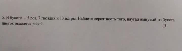 Помогите пожалуйста)) В букете - 5, 7 гвоздик и 13 астры. Найдите вероятность того, наугад вынутый из букета цветок окажется розой. Заранее спасибо))