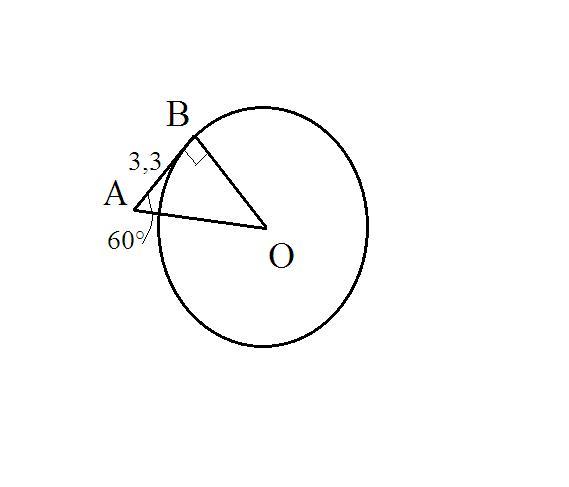 Прямая A B касается окружности с центром в точке O радиуса r в точке B . Найдите A O (в см), если известно, что A B = 3 , 3 см, ∠ O A B = 60 0 .