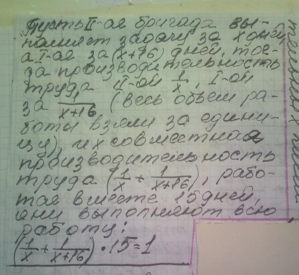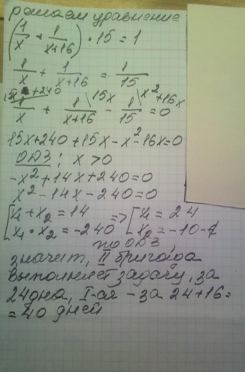 Две бригады вместе выполняют задачу за 15 дней. Если первой бригаде для выполнения всей задачи требуется на 16 дней больше, чем второй бригаде, то за сколько дней каждая бригада выполнит эту задачу в отдельности?