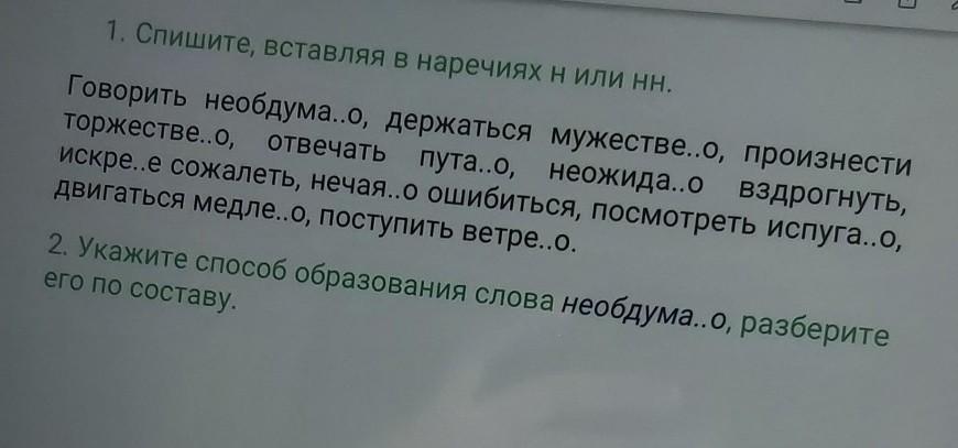 Ответ: необдуманно,мужественно,путано, неожиданно,искренне,нечаянно,испуганно,медленно,ветрено,