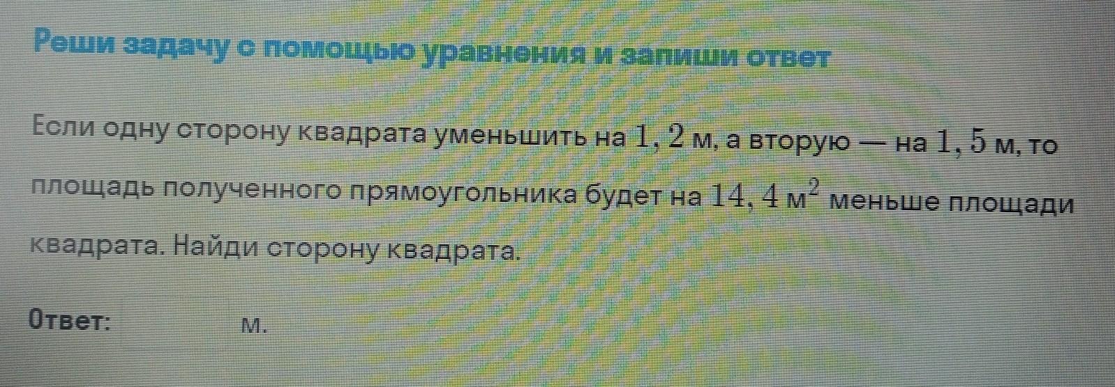 Пусть сторона квадрата х м, тогда при уменьшении на 1,2м одна сторона стала (х - 1,2)м, а другая при уменьшении на 1,5 м стала